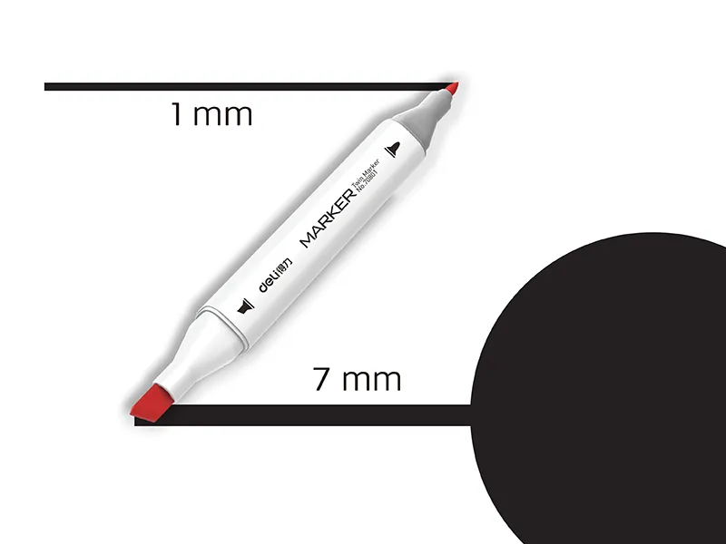DELI umetnički marker sa dva vrha. Zaobljen vrh debljine ispisa 1mm, kosi vrh debljine ispisa 7mm. Mastilo na bazi alkohola, brzo se suši.
