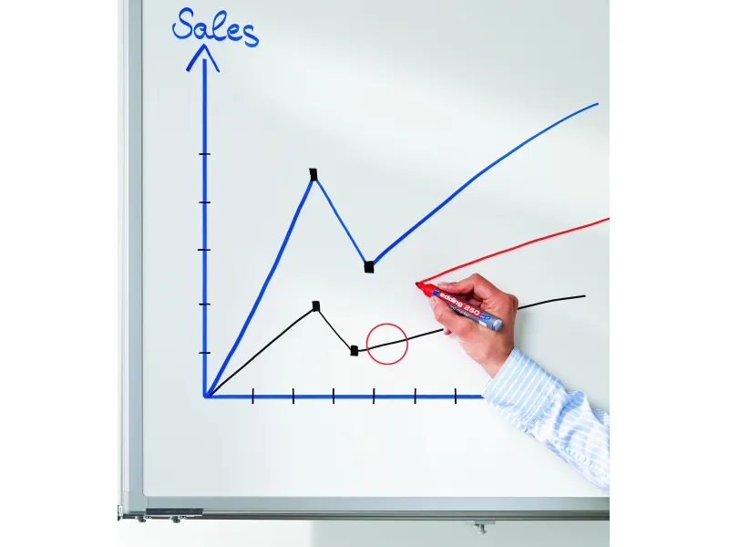 Markeri za belu tablu, koji se mogu nekoliko dana ostaviti nezatvoreni. Aluminijumsko telo. Obli vrh. Debljina linije: 1,5 - 3 mm. Pakovanje 10 kom.