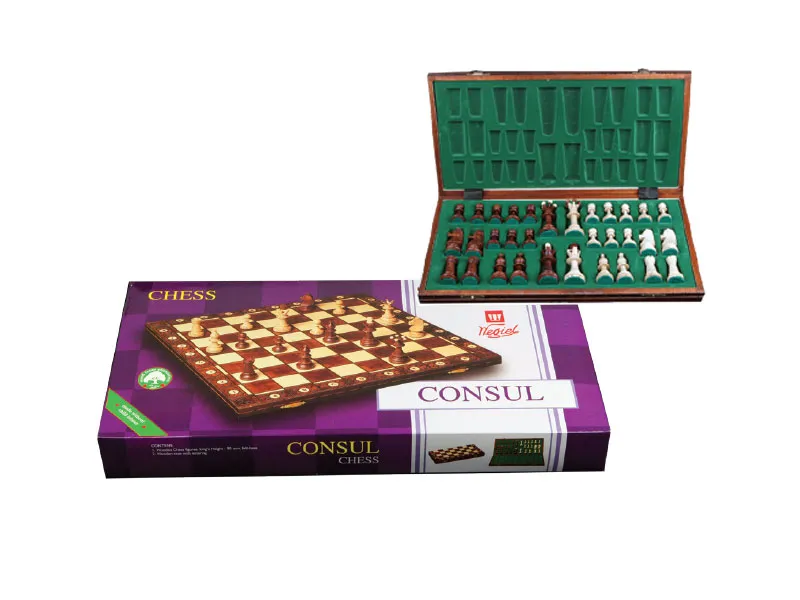 Šah garnitura Consul kombinuje klasičan dizajn i visok kvalitet izrade. Drvena tabla sa elegantnim završnim slojem i ručno izrađene figure čine ovu garnituru idealnim izborom za strastvene šahiste i kolekcionare.