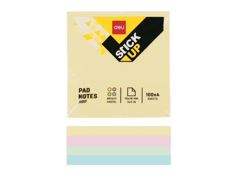 Stiker blok mix pastelnih boja, 4 x 100 stikera. Dimenzije: 76 x 76mm.