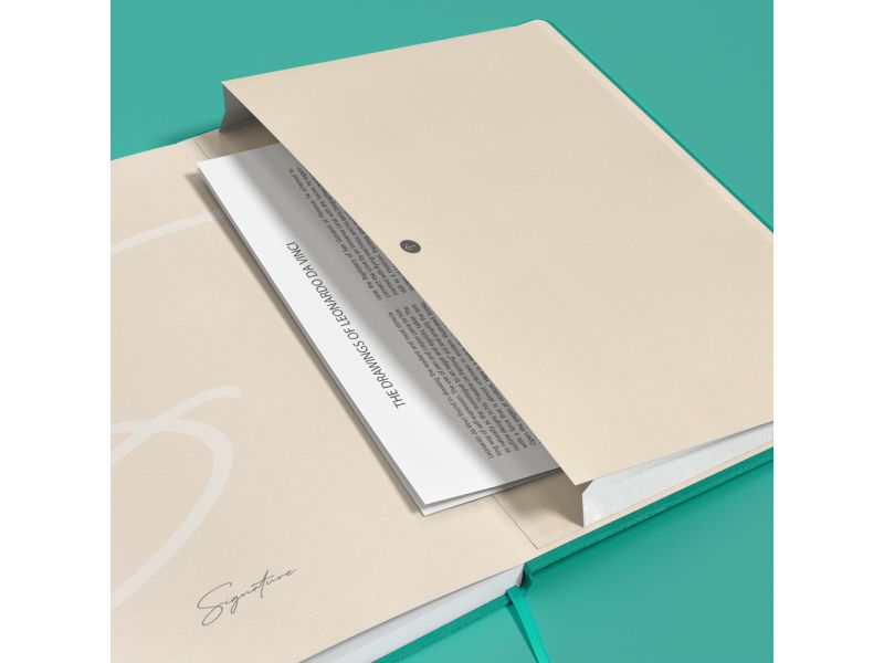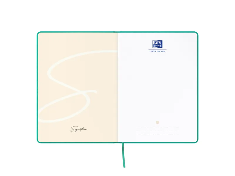 Kolekcija Signature A5 formata je jedinstvena beležnica sa veoma elegantnim, profesionalnim izgledom. Elegantne, tvrde korice od ekološke kože glatke površine. Sadržaji kao što su unutrašnji džep za dokumente, gumica za zatvaranje i traka za označavanje stranica čine ove sveske nezamenljivim za poslovne sastanke. Širok spektar pastelnih boja je još jedna karakteristika koja ih čini atraktivnim. Snežno beli i glatki Optik 90g papir. Rukopis se ne vidi sa suprotne strane.