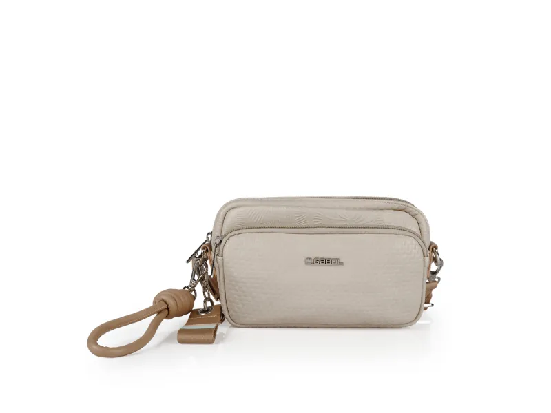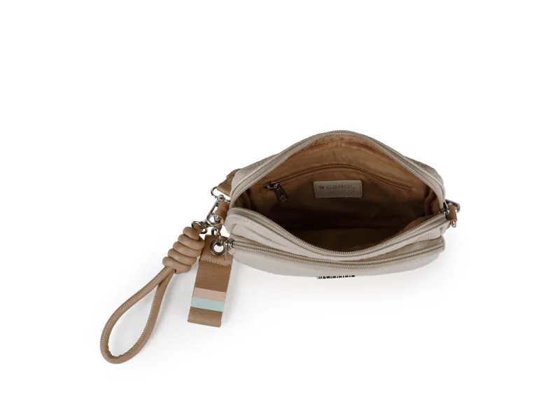 Kompaktna, ali sa dovoljno prostora za osnovne stvari, poput telefona, ključeva, novčanika... Prava prolećna torbica za laganu šetnju, stilski lako uklopiva. Izrađena od industrijske kože. Poseduje učkur za nošenje oko zgloba ili u ruci, kao i klasičan kaiš za preko ramena.