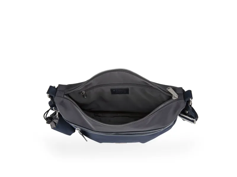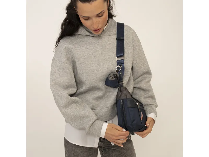 Kežual torba, idealne veličine sa opcijom povećanja prostora (proširova do 4 cm). Izradjena je od kombinacije kvalitetne sintetičke kože i sintetičkog poliestera, vodonepropusnog materijala, bez PVC primesa. Poseduje jednu prostranu glavnu pregradu, sa unutrašnjim džepom koji se zatvara zipom. Sa prednje i zadnje strane se nalaze dodatni džepovi. Uz svaku torbu dobijate mini privezak vrećicu, koja se zatvara učkurom, idealnu sa skrivene sitnice.
