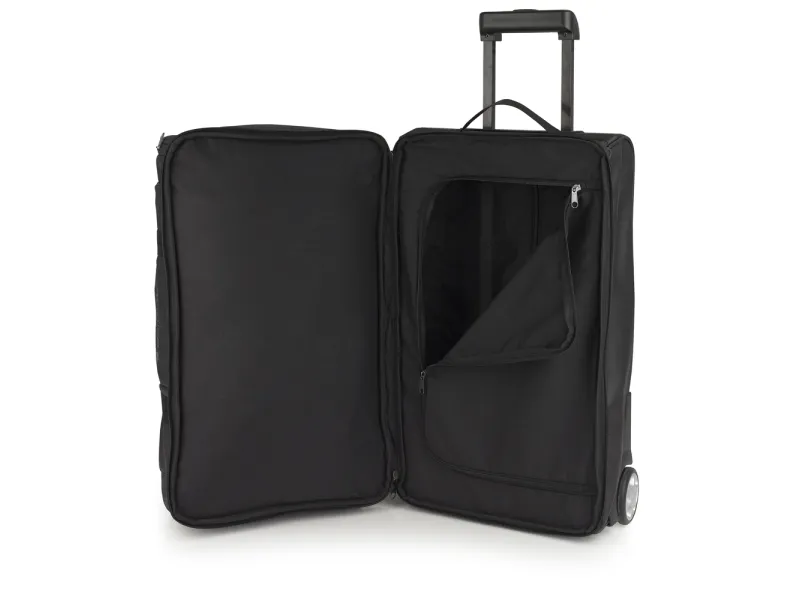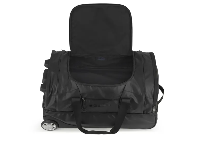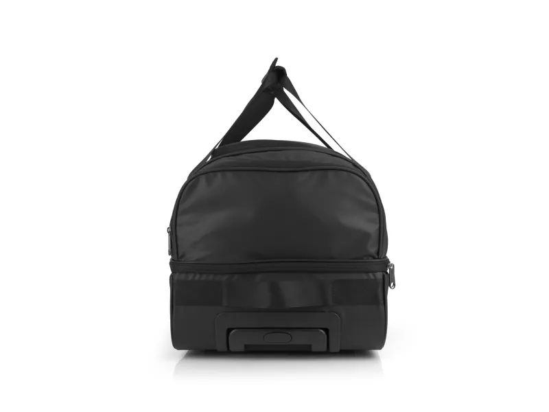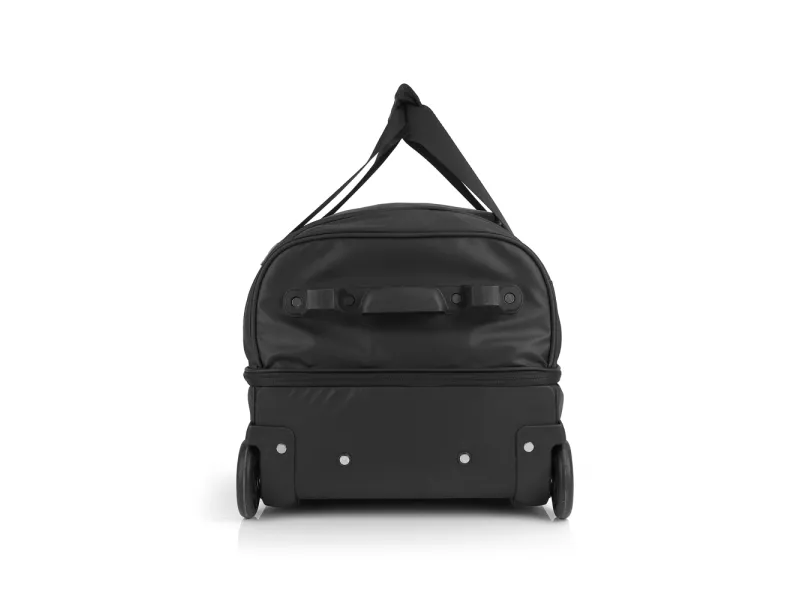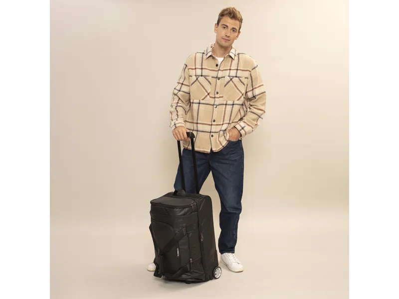 Veoma praktična putna torba sa dva točka. Sadrži dva odeljka: donji, koji se zatvara zipom, kao kod kofera i gornji, koji se pakuje sa gornje strane torbe. Kapacitet od 51l je sasvim solidan, čak i za duža putovanja. Dimenzije: 55x32x29 cm. Materijal: kombinacija postavljenog poliestera i veštačke kože.